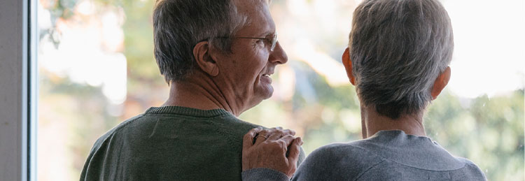Actor portrayals of man and woman looking out of window