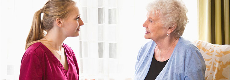 Actor portrayals of nurse talking to a woman in a chair